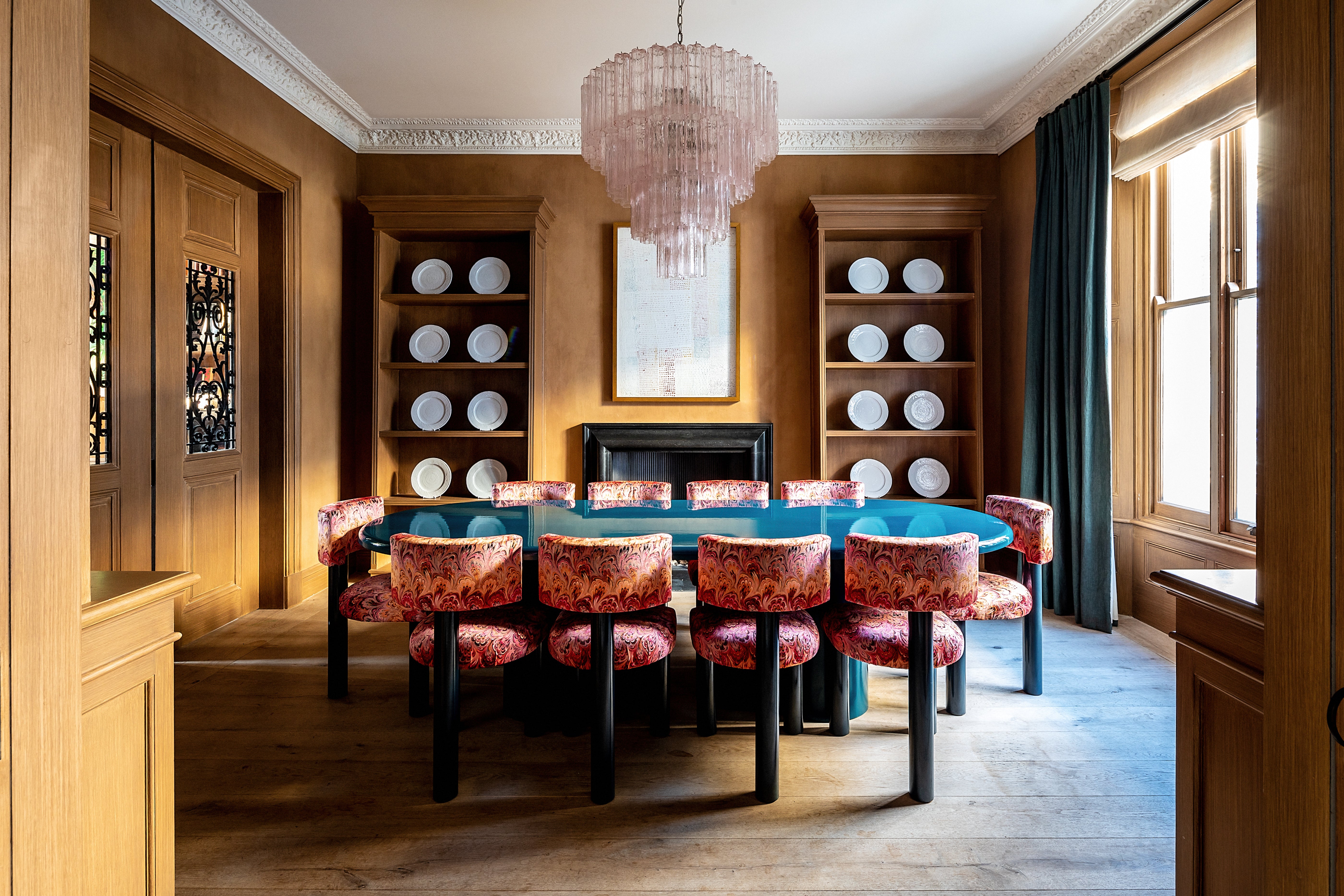Add a touch of drama to your dining space with The Clifford Dining Chair. These contemporary chairs feature a dark indigo blue frame and a curved back, making them a statement piece. Upholstered in vibrant marbled pink velvet, these chairs are the ultimate throne fit for royalty. Made in Britain and fully customisable, they are designer imagined for a luxurious dining experience.